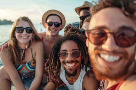 Diverse group of friends enjoying a sunny day by the waterfront, posing for a cheerful selfie, capturing the essence of friendship and happiness in a lively atmosphere