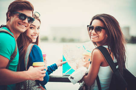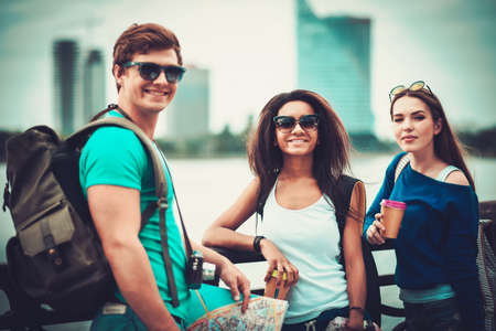 Multi-ethnic friends tourists with map and coffee cups near river in a city