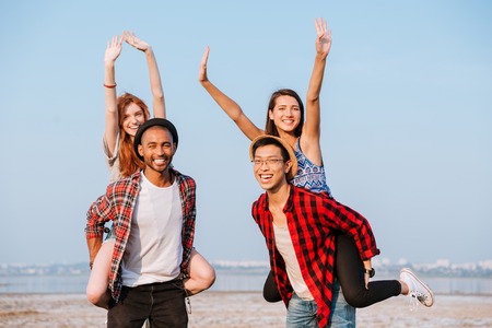 Two cheerful young men standing and holding girlfriends on their backs outdoors