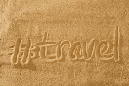 written words travel with hashtag on sand of beach with wave on background