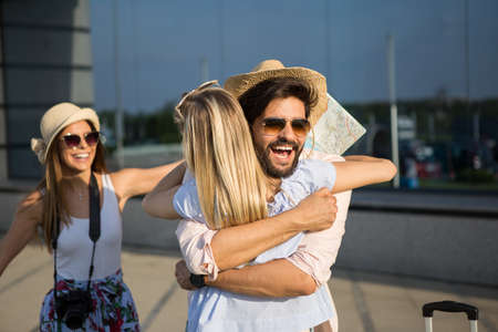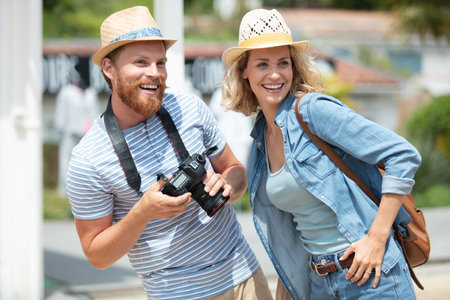 Smiling young tourists carrying backpacks are enjoying their vacation