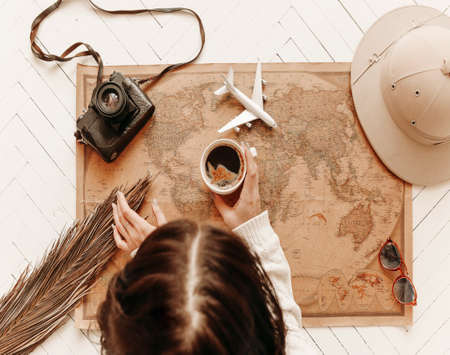 Top view of female holding cup of black coffee over vintage looking world map with traveler accessories, retro camera, toy plane laying on top of parquet floor. tourism and vacation concept