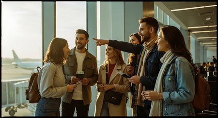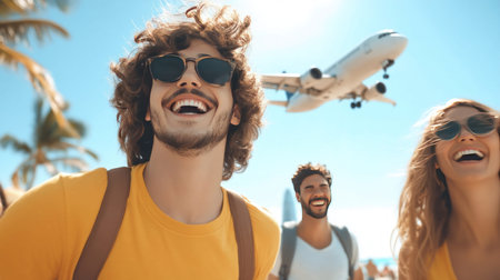 Group of friends smiling and laughing, with a plane flying overhead, enjoying their travel experience.