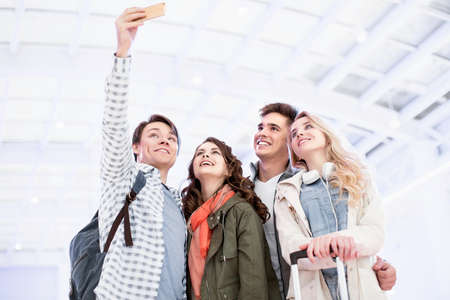 Three young tourists wearing backpacks are smiling in an airport terminal