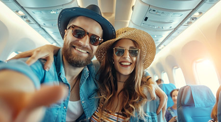 Happy young attractive couple take selfie on a plane while heading on vacation.