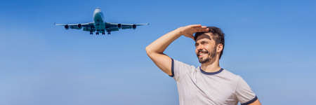 Man tourist have fun on the beach watching the landing planes. Traveling on an airplane concept. Text space. Island Phuket in Thailand. Impressive paradise. Hot beach Mai Khao. Amazing landscape BANNER, LONG FORMAT