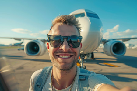 A man with sunglasses on is smiling and taking a selfie in front of an airplane. Concept of adventure and excitement, as the man is about to embark on a journey