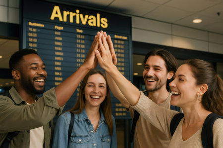 Group of friends joyfully giving high fives while celebrating their exciting arrival at the airport after a thrilling journey