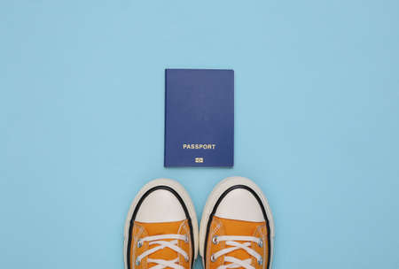 travel concept. Retro sneakers (gumshoes) with passport on blue background. top view. flat lay