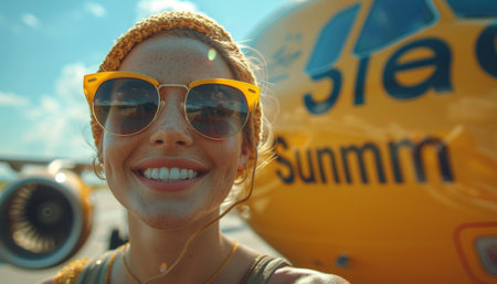 A woman wearing sunglasses is standing confidently in front of a large airplane. The clear blue sky serves as the backdrop to this scene.