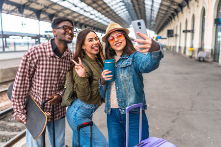 Three young tourists capturing a joyful selfie at a bustling train station, eagerly anticipating their next exciting adventure