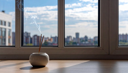 A peaceful scene showcasing incense sticks burning in a decorative pot, with soft smoke swirling into a serene environment, perfect for relaxation and meditation.