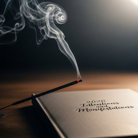 Incense burning in a holder on a table with gentle smoke trails, against a background of natural textures.