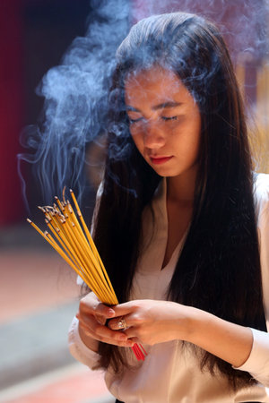 Chua On Lang taoist temple. Buddhist Worshipper. Burning incense sticks. Ho chi Minh City. Vietnam.