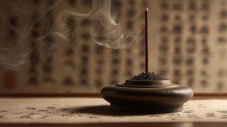 A close-up of a lit incense stick releasing delicate wisps of fragrant smoke into the air, creating a tranquil atmosphere and evoking feelings of peace and meditation.