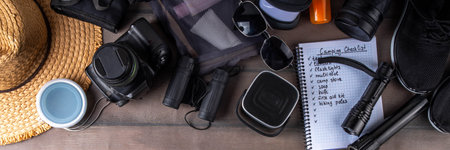 Preparing for adventure: essential items for travel and exploration laid on a rustic wooden table