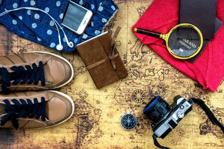Adventure concept. Traveler items on map background.