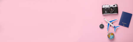 Camera, Passenger airplanes with compass, globe and passport on pink background. travel concept. Flat lay, top view. copy space
