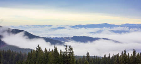 Panoramic view of the mountains covered with fog in the morning
