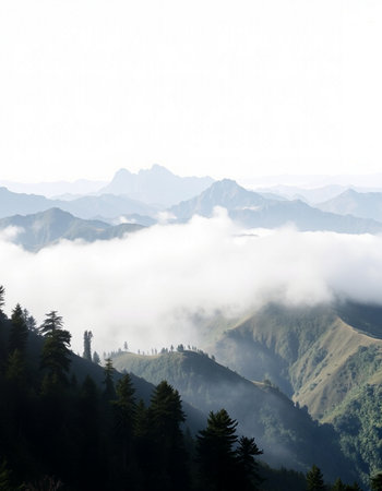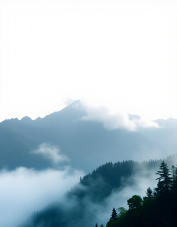 A breathtaking view of a misty mountain landscape featuring towering evergreen trees and a soft blanket of fog, evoking serenity and tranquility in nature's beauty.