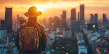 Young Woman traveling during Sunset visit in city downtown background, World Tourism Day - Ai Generated