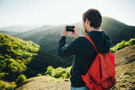 Man traveler with backpack makes a photo on your smartphone outdoors with mountains in the background. The concept of connection and communication in the journey.