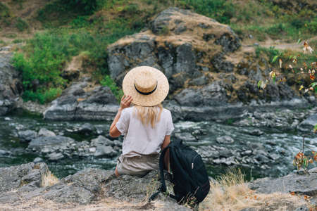 Young woman traveler in straw hat with backpack sits and looks at mountain river, local travel concept