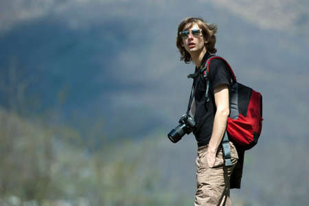 Digital composite of Hipster carrying backpack and photographing with camera while standing on cliff