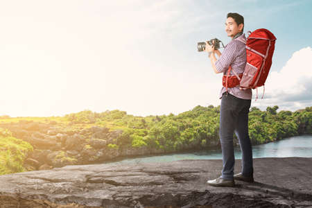 Asian man with a backpack holding camera with a lake view and blue sky background. World Tourism Day