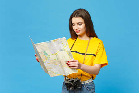 Portrait of beautiful young woman in vivid casual clothes with retro vintage photo camera hold paper city map isolated on blue wall background in studio. People lifestyle concept. Mock up copy space