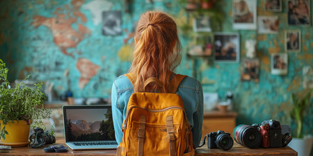 Artistic arrangement of a backpack, hat, camera, book, and map on a table. The visual arts composition includes patterns and textures, creating a unique and aesthetic display AIG50