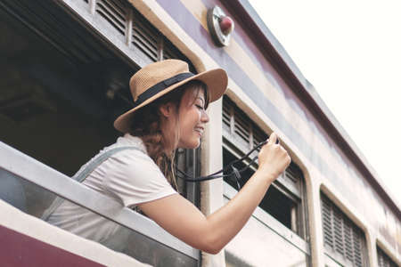 Attractive cheerful asian young woman wearing hat from window train holding camera in hand. Young girl leans out of the train window for looking interest place or tourist location.