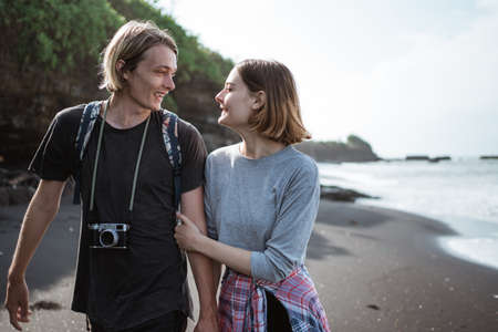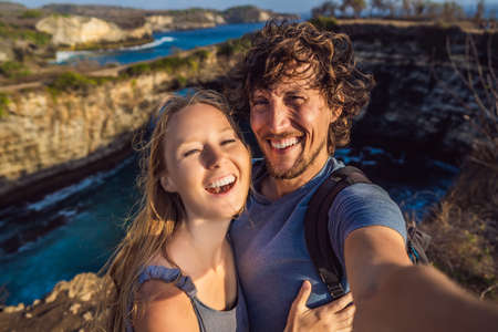 Man and woman in honeymoon near Broken Beach in Nusa Penida, Indonesia Angels BillaBong Beach. Popular tourist destination Bali