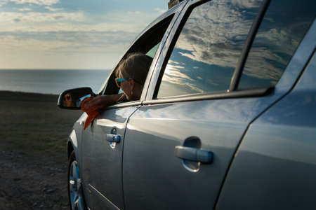 woman resting in car parked at sea beach. summer vacation