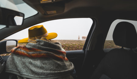 A man wearing a yellow hat is sitting in a car looking out the window, tourist in the peruvian andes