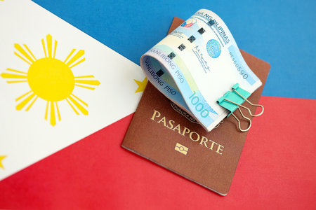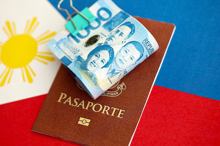 Philippines peso currency money bills and passport lies on flag close up. The concept of travel and vacation