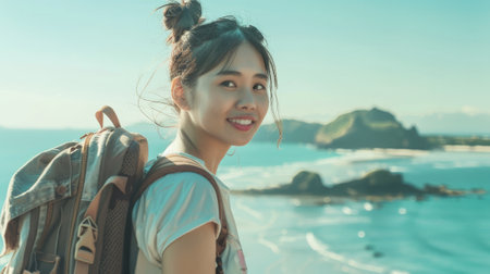 A woman with a backpack is smiling at the camera. She is standing on a beach with a beautiful view of the ocean