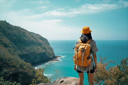 young asian woman backpacker enjoy the view on mountain peak cliff
