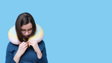 Portrait of a student girl in glasses and a sweater sleeping in a travel pillow on a blue background, banner, copy space. A woman at rest with a pillow for her neck. The concept of travel