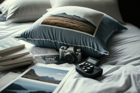 pile of pillows with travel brochures and camera on bed, created with generative ai