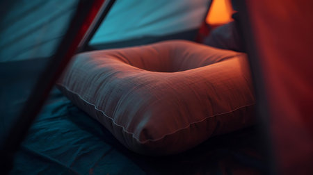 Camping tent with a pillow in the night. Close-up.