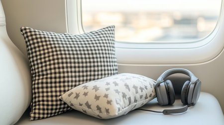 Experience the perfect travel setup featuring stylish cushions and headphones by a window, showcasing an upscale atmosphere ideal for comfort during journeys.