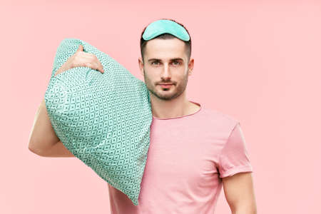 Young handsome man in sleeping mask holding pillow in hands