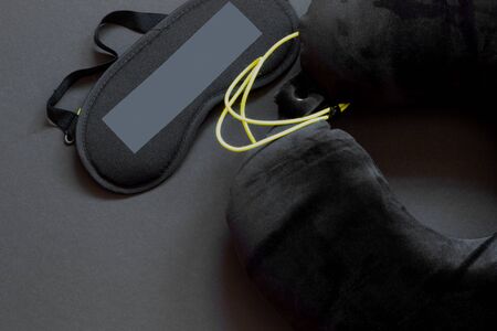 Sleeping accessories, mask, earplugs, pillow for travels and airplane. Sleep care and symbols