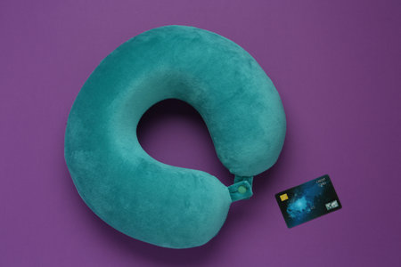 Turquoise travel pillow and credit card on purple background, flat lay