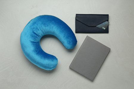 Light blue travel pillow, notebook and wallet with credit card on gray background, flat lay