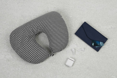 Soft travel pillow, purse and earphones on gray textured background, flat lay
