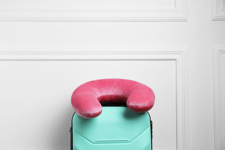 Pink travel pillow on turquoise suitcase near white wall, space for text