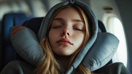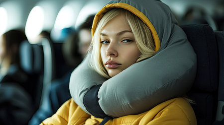 Girl places cushion beneath neck before flight, Generative AI