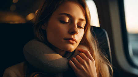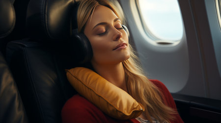 A serene woman rests her head on a travel pillow while seated on an airplane. The soft lighting enhances the tranquil atmosphere, creating a moment of relaxation during her journey.